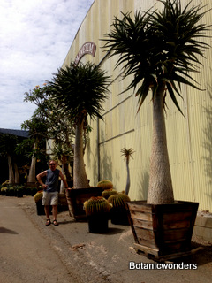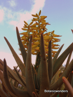 Leaves of Aloe dichotoma have a bluish color with teeth along the margins. I have found the first "split" of the growing rosette usually occurs at about one meter or so. One of the characteristics of Aloe dichotoma I really like is the trunk. As the trunk grows it becomes swollen, and develops a rich character. The trunk forms fissures, and various color appear which give the appearance of great age and strength. My Aloe dichotoma plants have taken approximately 10 years to reach blooming size. Flowers are born on a inflorescence. They are numerous and bright yellow in color.