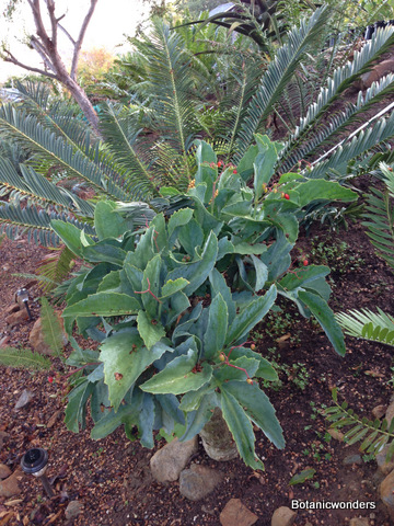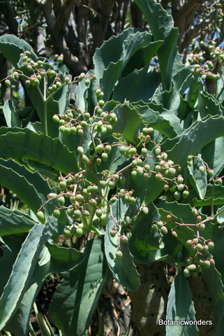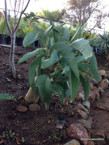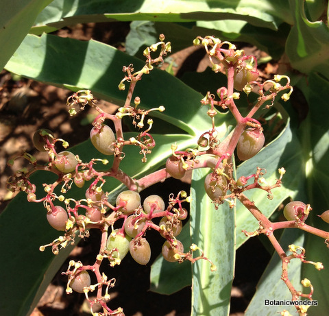 Cyphostemma juttae and currorii are both from southwest Africa, where they grow in desert conditions. Cyphostemma juttae is the most common of the two. It has distinctive large green leaves with a pinkish cast. The fruit also has the same pinkish-red cast. Cyphostemma's can grow into large plants when planted in the landscape, however this is not common since they require a climate with little or no frost. Cyphostemma currorii has large pale green leaves covered with tomentum. It is my favorite of the two species, but less common in cultivation. C. juttae produces seeds easily since the flowers are monoecious, C. currorii takes longer to reach flowering age. My plants are just now starting to flower and produce seeds. Both species go dormant in the winter and lose their leaves.