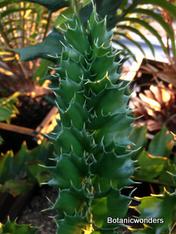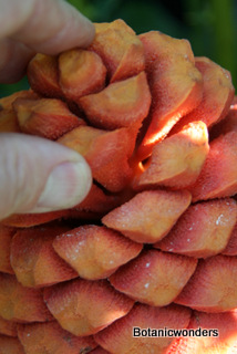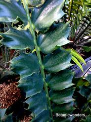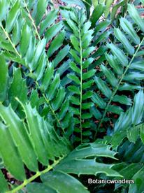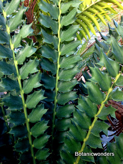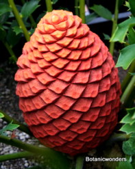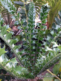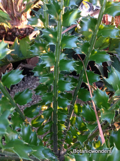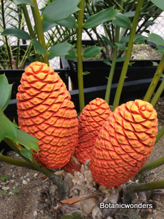 Encephalartos ferox is a beautiful ornamental cycad. This species of Encephalartos originates from the coastlines of South Africa. Most plants are found growing in part to full sun. Their native environment is very hot and humid. Most plants grow in well draining, sandy soil. The leaves of Encephalartos ferox are very prickly, and shaped like a large holly leaf, hence the name ferox. The one characteristic that sets this species apart from are the bright orange cones. As with all cycads individual plants are male or female. Female cones are large and round shaped, while male cones are long and elongated. Leaves are dark green growing to 3-6 feet in length, shorter in full sun and longer in the shade.This is not a tall growing cycad. Trunks grow up to 3-5 feet in height. This is one of my favorite landscape plants.