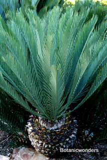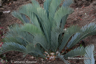 Encephalartos lehmannii is a beautiful blue cycad from the continent of Africa. It has quickly become one of my favorites. The species originates from South Africa, Eastern Cape province. This area is know for its desert like conditions. There is rainfall, however sporadic, and drought is common. Encephalartos lehmannii has beautiful blue leaves which make it a standout in the landscape. It's a medium sized cycad, rarely exceeding 4-5 feet in height. Leaves on mature plants can reach 3-5 feet in length. Leaflets are generally inserted in the rachis at an angle. When viewed in a cross section the leaflets form a "V" shape. There are some distinct variations of E. lehmannii. One of the better know variations comes from the area of Kirkwood, which it is named after. The Kirkwood form has leaves that are longer and more arched than the "typical" form. These forms are sought after by collectors for their "graceful" look. A useful feature used in identification is the yellow-tan collar where the leaflets are attached to the caudex of the plant. This coloration is more intense than the other blue cycads from South Africa. Older leaves will lose their blue color and turn green.