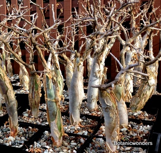Bursera are relatively easy to grow. They prefer a well drained soil, with at least 50 percent inorganic material like pumice or perilite. I grow most of my plants with at least half day sun. They will look better if you can give them full day sun. Growing them "hard" with give them the cool character of a plant grown in its natural environment. I also prune my plants at least two times a year, cutting leggy growth back, this also helps to thicken up the trunk. Keep soil lightly damp between waterings and fertilize as needed. I believe Bursera are best grown from seed. They will develop fat trunks quicker than if grown from cuttings. If your plants form seed pods wait until the pod splits and exposes the brightly colored seed within. The seed with stay attached to the stem which makes harvesting easy. Plant seed into a well drained soil, cover with about half inch soil, and keep damp. Germination is in about 7-10 days. Don't miss growing plants from this genus you will not be disappointed!