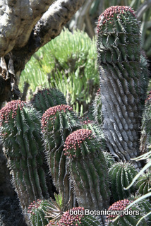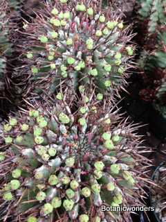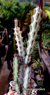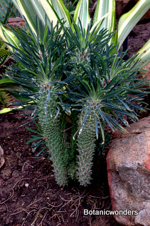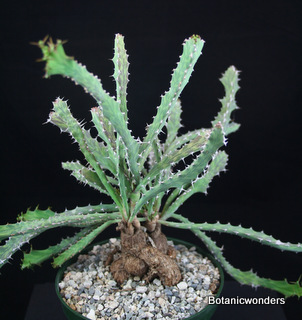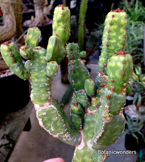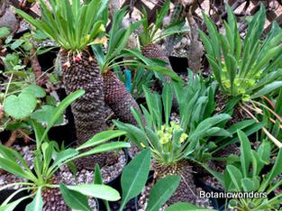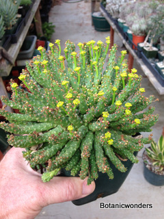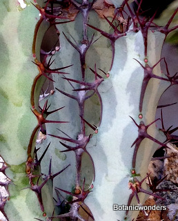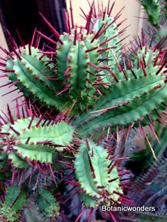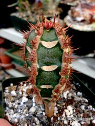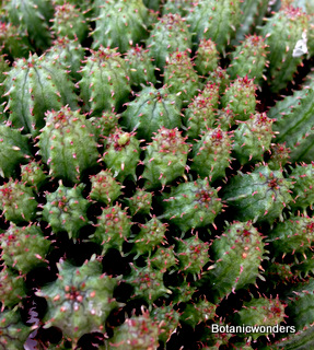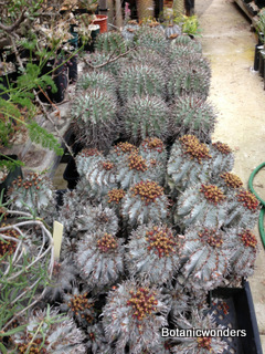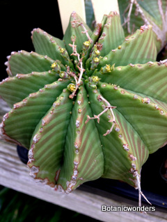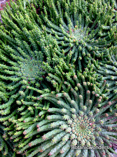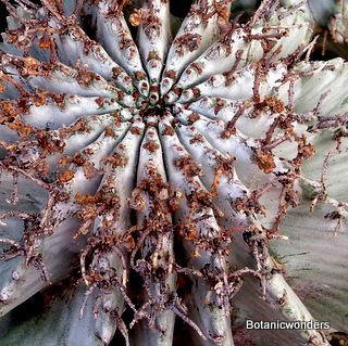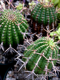 The family of Euphorbiaceae is large and diverse. It is estimated that there are in excess of 5000 species from around the world. Of this group there are hundreds of succulent Euphorbias. Many of the succulent Euphorbias originate from Africa and Madagascar. However many Euphorbias originate from other countries like the common Poinsettia which is from Mexico. All Euphorbias have a white milky sap which can burn the skin. Always wash your hands after handling Euphorbias! I make it habit to always wash may hands after being in the nursery regardless of what plants I have handled. Euphorbias come in all shapes and sizes which make them a collectors dream. I remember my first Euphorbia, E. obesa, the "Baseball Euphorbia". I thought it was the coolest plant I ever saw. Another of my favorites is E. bupleurifolia, which looks like a mini pineapple.