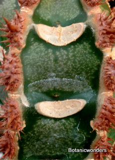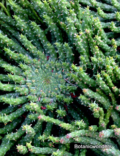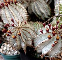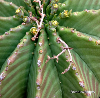 Most Euphorbia plants have flowers that produce three seeds per pod. After the seed pod ripens and dries, it eventually pops and shoots the seeds into the air landing where they may. Many growers will wrap seed pods in netting to capture the seeds. Some other favorites of mine are the Madagascar species that can look like mini palm trees. Many have beautiful lush green leaves. There are so many forms, you will be sure to find something that will strike your fancy, from forms that resemble cacti, to others that look like a rosettes with many "arms" radiating from the center. You will never get bored looking for new species to grow!