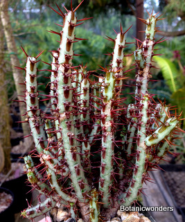 Since there are so many different species of Euphorbia and originating from so many different environments, it is difficult to summarize their care. There are however some basic cultural practices that can be applied to most species. Most Euphorbias prefer part to full sun. Even plants that grow in full sun in their natural environment will enjoy some shade. All my plants receive some shade during the day, and most are under 30-50 percent shade, with occasional direct sun during sometime of the day. As for soil, I prefer to use a well drained mix of 50% inorganic material such as pumice and 50% organic material such as a commercial potting mix. Some species may require more inorganics, which you will learn from research and growing experience. During summer months I water once or twice a week depending on weather and species. Euphorbias like food! Feed you plants regularly! I feed once a week with water soluble fertilizer that contains all major and micro nutrients. If your plants have yelllow leaves with dark veins you are missing a micro nutrient such as iron. Increase the feeding to correct the problem. Euphorbias can be grown from cuttings or seeds easily. When taking cuttings wear gloves since the white sap can burn your skin. Take cuttings at joint, and make a clean cut with a knife or pruner. A jagged cut can lead to infection and death to your plant. Another fun way to start plants is from seed. Plant seeds in a well drained mix. They will germinate in about one to two weeks. They are fun to grow, and will gain size quickly.
