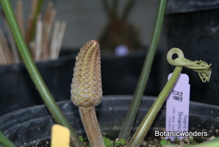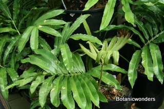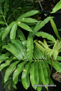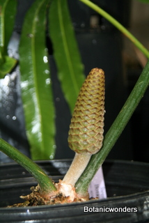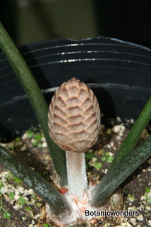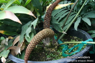 Stangeria eriopus is a very different looking cycad. So different that when it was first discovered in 1939 it was thought to be a type of fern. S. eriopus originates from South Africa on the eastern cost. There are two distinct forms, one growing in the open grasslands and one growing as an under-story plant in forested areas. The photos on this page are of the forest variety. This type produces a caudex at the surface or below the soil. Stems grow up to ten inches in diameter, and produce a distinctive white "wool" at the leaf bases. The leaf petiole has no spines or prickles. Leaf margins of S. eriopus can vary even on the same plant, being entire (smooth), serrated, or lobed. The forest variety produces leaves which can reach a length of 6 feet. In contrast the grassland variety produces shorter and fewer leaves. Leaves grow one at a time producing a "bush" of 3 or more leaves. The female cone is ovoid, or egg shaped, while the male cone is elongated and narrow. Female cones can yield as many as 100 seeds. S. eriopus is fast growing. Plants will cone in as little as five years from seed. Grows best in filtered light. Keep protected from hot direct sun. Prefers well drained soil, but moist. Protect from frosts. Excellent plant for a greenhouse or conservatory.