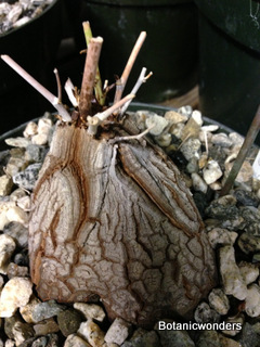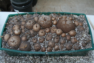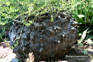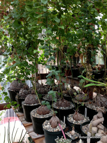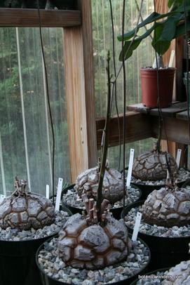 Dioscorea elephantipes originates from South Africa. Mature specimens weight can reach in the hundreds of pounds, and up to 7 feet in diameter! Most plants in cultivation are much smaller, but just as impressive. Almost all my personal specimens started out as small 2-3 inch diameter plants. After about 10-13 years my plants are now blooming and producing seeds. D. elephantipes is dioecious, which means you must have a male and female plant to produce flowers. Unfortunately this species seems to produce more male plants than female. In my collection female plants are about 25% of the total collection. These plants can be slow growing , but well worth the time and effort. I have just planted-out four plants in my garden to see if they will grow faster and produce more seed, two male and two female plants. I will update this page in the future to keep everyone updated.