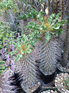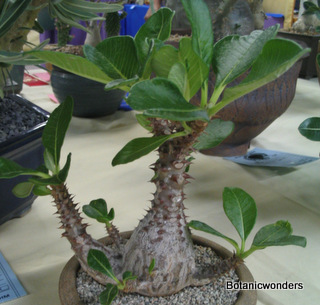 I would not consider Pachypodiums the easiest succulent plants to grow. Some species like Pachypodium lamerei do fall into the category of easy, while others can be very difficult to grow. Pachypodiums prefer plenty of sun. Give them at least half day sun for good growth. Temperatures should never fall below 50 degrees Fahrenheit for optimum growth. My plants are grown outdoors with temps. as low as 36 degrees F. With conditions like this keep plants dry and protected. I have lost many a plant with wet soil and cold temps. Soil should be well drained with a minimum of 50% perlite and 50% organics. Do not over-pot! Pachypodiums do best in small pots with limited root space. Putting your plants in large pots will not make them grow faster, it is a recipe for disaster. I have learned this the hard way! Some of my plants have been in the same pot for over ten years! Growing your plants "hard" will produce fat, compact growth which will resemble how these plants grow in nature. Many Pachypodiums will go dormant during winter months. Let them go dry between waterings, but not bone dry. Some species like Pachypodium namaquanum will go dormant in summer. Follow same procedure. All Pachyoodiums like light frequent feedings to maintain good growth. When plants are coming out of dormancy be careful not to over water to quickly. Leaves will grow before roots start growing. Wait a week or two to resume growing season watering regieme. I kill more plants at this time of year than any other. Inot sure, wait!