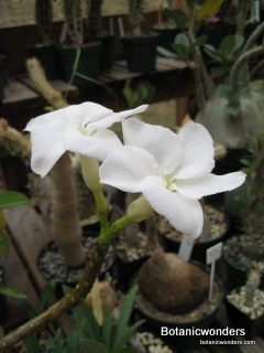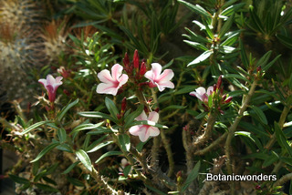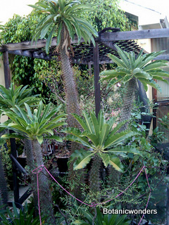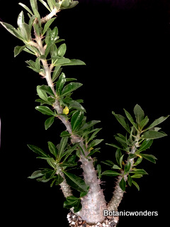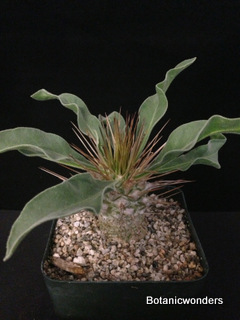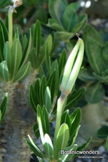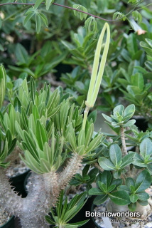 Pachypodiums were some of the first exotic succulent plants I became enamored with. The first specices I purchased was Pachypodium lamerei. This is most likely the first for many a collector, because of its high availability. Pachypodiums are indigenous to Africa and Madagascar. There are 25 plus species and subspecies. They are in the Apocynaceae family, which the more familiar plant Plumeria is also a member. This is quite evident when noticing the similarities of their flowers. In their natural environment Pachypodiums grow in very hostile conditions. Most grow in full sun, desert conditions, and between rocks and gravel which increase the heat they are exposed to via reflection. According to Gordon Rowley, Pachypodium brevicaule has been recorded growing in temperatures up to 70 degrees Celsius or 158 degrees Fahrenheit! As a result of these extreme conditions Pachypodiums grow "fat" swollen trunks. All species have spines, with Pachypodium decaryi having the tiniest. With good care most Pachypodiums will bloom at a young age. Most indigenous pollinators don't know how to pollinate their flowers. Fortunately they are not that difficult to pollinate by hand. With a little research and practice you can produce your own seeds. Seeds germinate easily, and grow relatively quickly.