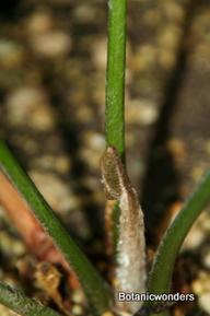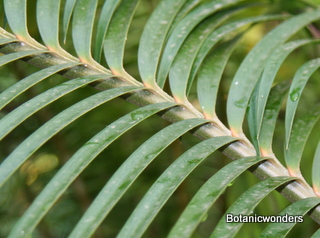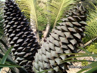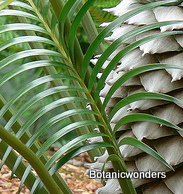 Lepidozamia peroffskyana is one of two species in the genus Lepidozamia, the other being L. hopei. L. peroffskyana is the more common species in cultivation. Lepidozamia's originate from Australia. They grow in protected forests, mostly in shaded and wet conditions. In their natural environment they can attain a trunk height over 20 feet tall. It's leaves can grow up to 10 feet in length, with a beautiful "arching" look, and a dark glossy green color. Leaflets emerge from the top of the rachis (leaf stem), which is a helpful in identification. Another feature that stands out is it's lack of spines. Most species of cycads have some type of spines or prickles, but L. peroffskyana has none, which makes this cycad very "gardener friendly". Cones are very distinctive, with the female cone being large and dramatic, weighing up to 60 pounds! As a result seeds are also very large, approx. 2.75 inches in length. Male cones are also unique, being up to 30 inches long with a open spiral pattern.