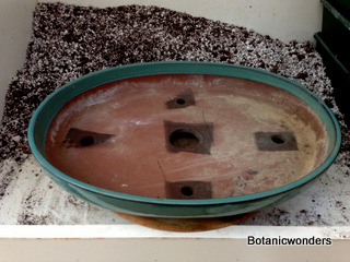Step one: Choose your container. We chose a shallow bonsai dish. We used old window screening material to cover the drainage holes.