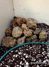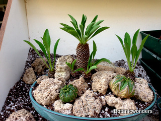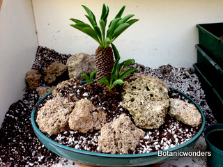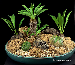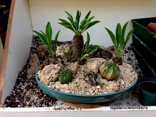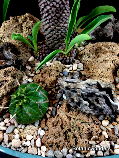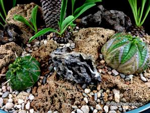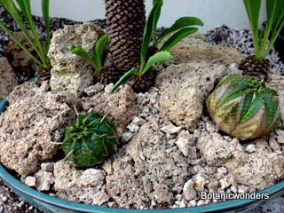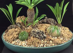 In this feature we will demonstrate how to create a succulent bonsai scene. For this project we used Euphorbia bupleurifolia as our main focal point. We chose three plants, one specimen and two smaller plants. The other species was Euphorbia meloformis, which two plants were chosen. Other materials used where travertine rocks, drift wood, and small river rock. This is a fun project that will challenge your creativity and reward you with a wonderful miniature landscape. This planter will grow best in partial sun. Use the steps below as a guideline, and apply your own creative ideas to make it your own!