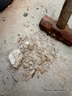 Step six: Now take a rock that has little "character" and break it up into small pieces. Make sure you use safety glasses for eye protection!